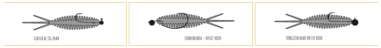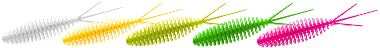 Turbo Worm, если можно так выразиться, представляет собой комбинацию приманки типа куколки с червяком. Тело, несколько напоминающее по общему виду личинку, разделено на множество элементов. Ребра, как и в классическом радиаторе, делают приманку очень подвижной и поэтому чрезвычайно подвижной. На конце приманки есть три тонкие ножки, которые реагируют даже на малейшее движение воды. Когда приманка свободно извлекается, вода, омывающая тело Turbo Worm, вызывает вибрацию всей приманки, вплоть до кончиков ножек. Каждое дополнительное движение удилища вызывает дополнительные движения приманки. Turbo Worm предлагается в одном размере, 56 мм с запахом сыра.