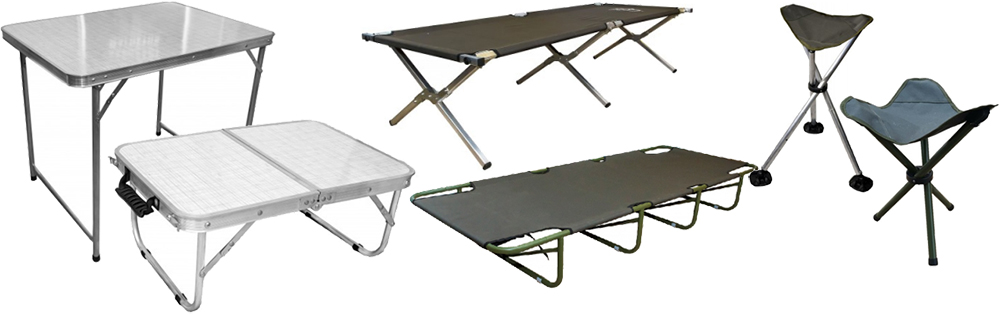 Компания Новый горизонт предоставляет различные варианты мебели - табуреты, стулья, кресла, раскладушки. Модели выполнены с двумя вариантами каркаса - сталь и алюминий.