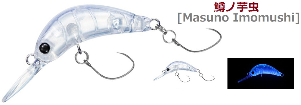 Воблер Daiwa Masuno Imomushi оснащен одинарными безбородыми крючками. Некоторые расцветки светятся в темноте.