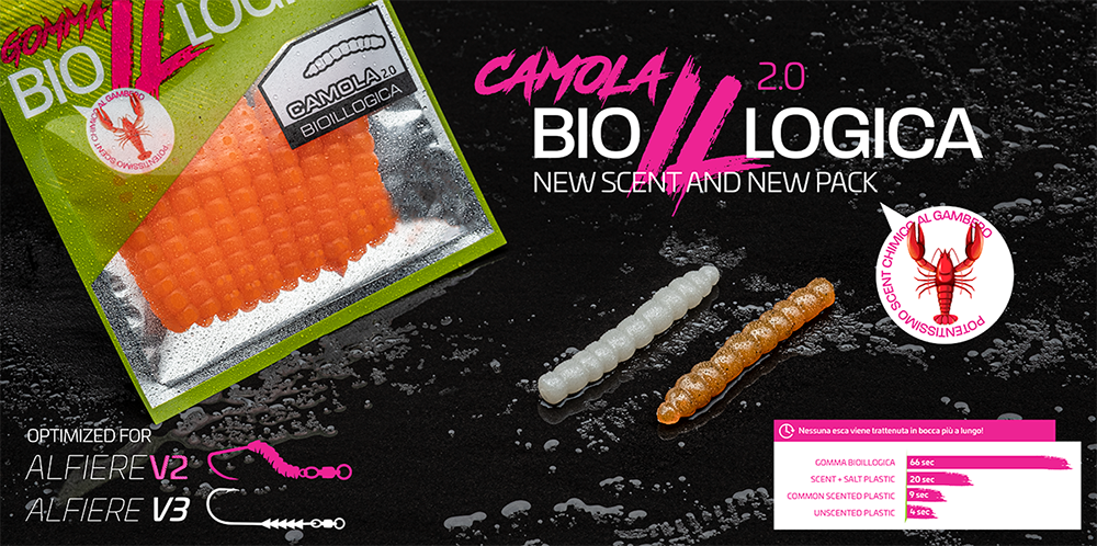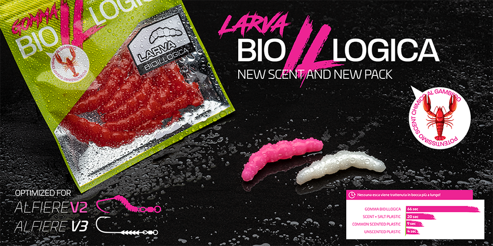 В новых типах приманок Gomma BioiLLogica от GAME by Laboratorio применен новый тип низкотемпературного нейтрального силикона повышенной мягкости и пластичности. Живучесть приманок выроста в несколько раз, приманки отлично работают и не теряют мягкости даже в воде на грани замерзания. При изготовлении приманок аттрактант образуется уже в ходе формирования в результате химической реакции, поэтому практически не вымывается из силикона.