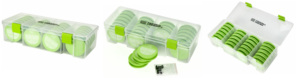 Пластиковая коробка Feeder Concept Eva Line Winder Box с круглыми мотовилами из материала EVA для хранения и транспортировки готовых фидерных поводков. В коробке находятся 24 мотовила диаметром 65мм, каждое мотовило укомплектовано булавкой для фиксации поводка. Хранение поводков на мотовилах круглой формы более предпочтительно, так как в этом случае поводок всегда остаётся ровным, и на нём не появляются "заломы", что характерно для мотовил другой формы.