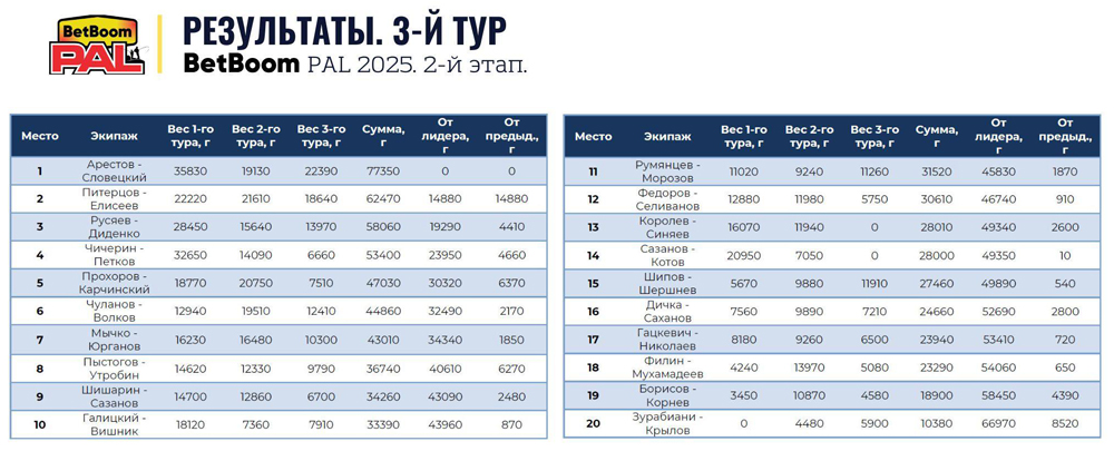 В итоге, экипаж Максима Арестова и Евгения Словецкого стал Победителем Финального этапа BetBoom PAL2025! Их результат за три тура составил 77 килограмм 350 грамм! Также эта команда получила специальный приз от BetBoom "Самая тяжелая сумка сезона" - 35 кг 830 г - это самый большой вес за один тур.