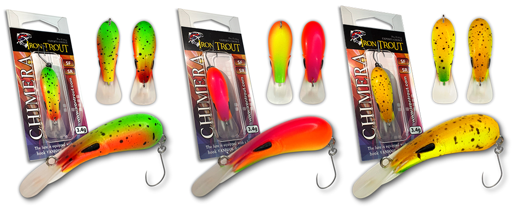 Iron Trout Chimera SF-SR - плавающий воблер имеет совершенно хаотичную нешаблонную игру, для ловли прудовой форели и другой хищной рыбы. Вес приманки 3.4g при длине 55 мм. Обладая оригинальной формой, приманка обладает уникальной, частой, неширокой игрой из стороны в сторону, переваливаясь с боку набок создает совершенно непредсказуемые движения в воде, имитируя раненую рыбку, провоцируя на поклевки пассивную рыбу. Нетипичная развесовка позволяет совершать воблеру движения вперед и назад напоминая мелкий и интенсивный джиг.