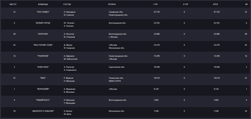Большинство команд также привезли на взвешивание достойные экземпляры. Итоговая таблица первой десятки лидеров 1-го тура осенних соревнований "Золотой судак-2025" выглядит следующим образом: