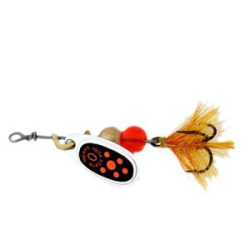 C оранжевой мушкой на тройнике. если вспомнить особенности данного вида блесен, то будет понятно, что эта комбинация очень естественна. Исходя из практического опыта многих рыболовов, применение приманок с мушкой способно как повысить, так и снизить эффективность применения. Например, для форели предпочтительнее блесны без мушки. В то же время, при ловле окуня и щуки, мушка окажется очень кстати. Она служит дополнительным раздражителем и улучшает общий баланс блесны, что очень желательно при медленной проводке на водоемах без течения.