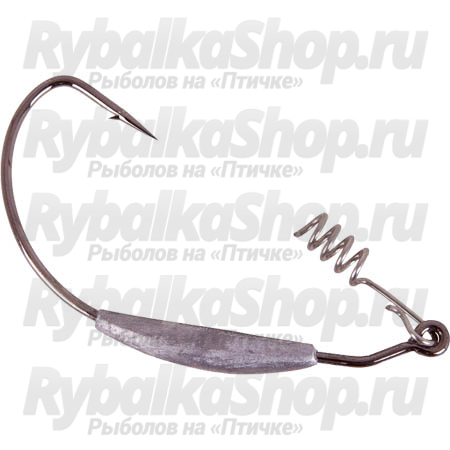 имеет фиксированный груз, расположенный на изгибе цевья, смещенный в сторону колечка крепления. Кроме того, фиксировать приманку предполагается при помощи пружиновидной спиральки. Использование огруженных офсетников расширяет возможности оснастки. Как мы видим, груз смещен в сторону крепления, и поэтому при паузах в проводке приманка будет плавно углубляться головной частью силикона вниз.
