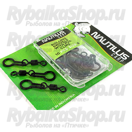 Nautilus Rolling Swivels With PVA Clips – вертлюг с клипсой для крепления PVA сетки. Конструкция позволяет крепить мешок прямо за узел, не применяя дополнительных узлов и приспособлений.
