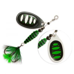 Лепесток блесны прежде всего отличается своим декором - он двусторонний и к тому же еще и реверсивный. При вращении лепестка удалось добиться оригинального эффекта, близкого к объемному изображению. Хищник видит мельтешащий, провоцирующий рисунок лепестка под любым углом обзора. Это ли не повод для атаки? Строение сердечника. Он наборный, состоящий из нескольких шариков разного диаметра. Именно за счет сердечника центр тяжести блесны несколько иной, он чуть смещен к задней части тела, что положительно сказывается на дальности и точности заброса.