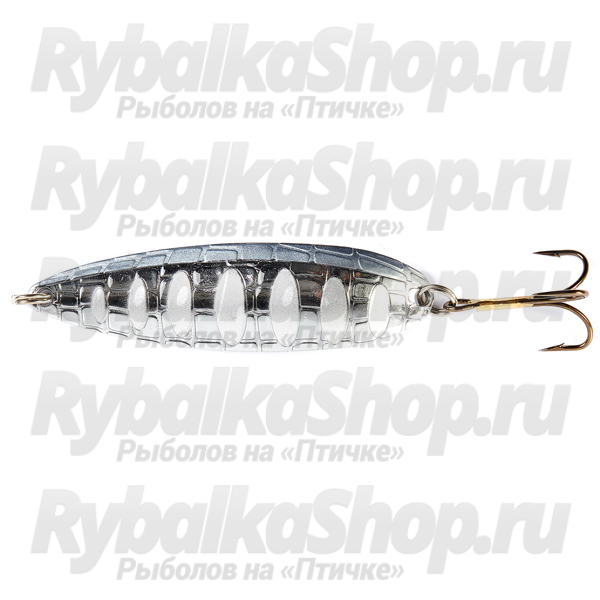 Приманка имеет вытянутую форму, выпуклость тела небольшая, ближе к тройнику профиль изгибается. Благодаря таким нюансам блесна Lucky John Croco Spoon идет размашисто, виляя в стороны и играя своими рифлеными боками. Внешняя поверхность приманки имеет рельефную структуру «под крокодиловую кожу». Кстати, отсюда и название, которое получила блесна - Croco Spoon.