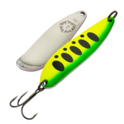 Приманка имеет один, но очень острый и надежный крючок-тройник и допускает проводку задом наперед, при перестановке крючка. Форма блесны типичная, похожа на плотву.