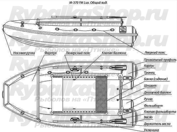 Лодка надувная из ПВХ FM Lux состоит из подковообразного баллона, разделенного на 3 независимых отсека, с приклеенным к нему фальшбортом, состоящим из двух независимых одноотсековых баллонов. Нос сверху закрыт откидывающимся фартуком. В корме корпуса установлен транец, служащий для крепления подвесного мотора. Дно лодки образуют 3 продольных баллона, приклеенных к самоотливной палубе, находящейся при полной загрузке лодки выше уровня воды. Лодка оборудована двумя уключинами, обеспечивающими ее движение под веслами. В сложенном состоянии надувная лодка из ПВХ перевозится в одной упаковочной сумке. На корме и носу надувной лодки установлены ручки, служащие для ее переноски в рабочем состоянии.