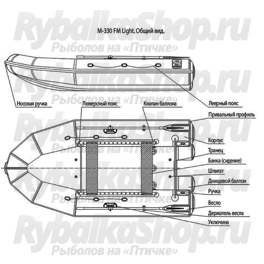 Лодка надувная ПВХ Фрегат FM Light состоит из подковообразного баллона, разделенного на 2 независимых отсека. В корме корпуса установлен транец, служащий для крепления подвесного мотора. Дно лодки образуют 3 продольных баллона, приклеенных к самоотливной палубе, находящейся при полной загрузке лодки выше уровня воды. Лодка ПВХ оборудована двумя уключинами, обеспечивающими ее движение под веслами. В сложенном состоянии лодка перевозится в одной упаковочной сумке. На корме и носу надувной лодки ПВХ установлены ручки, служащие для ее переноски в рабочем состоянии. Надувная моторная лодка ПВХ проста в сборке, может эксплуатироваться под мотором до 15 л.с. Рекомендуемый размер дейдвуда (ноги) подвесного лодочного мотора — 15″ дюймов (381 мм), импортное обозначение длины ноги «S».