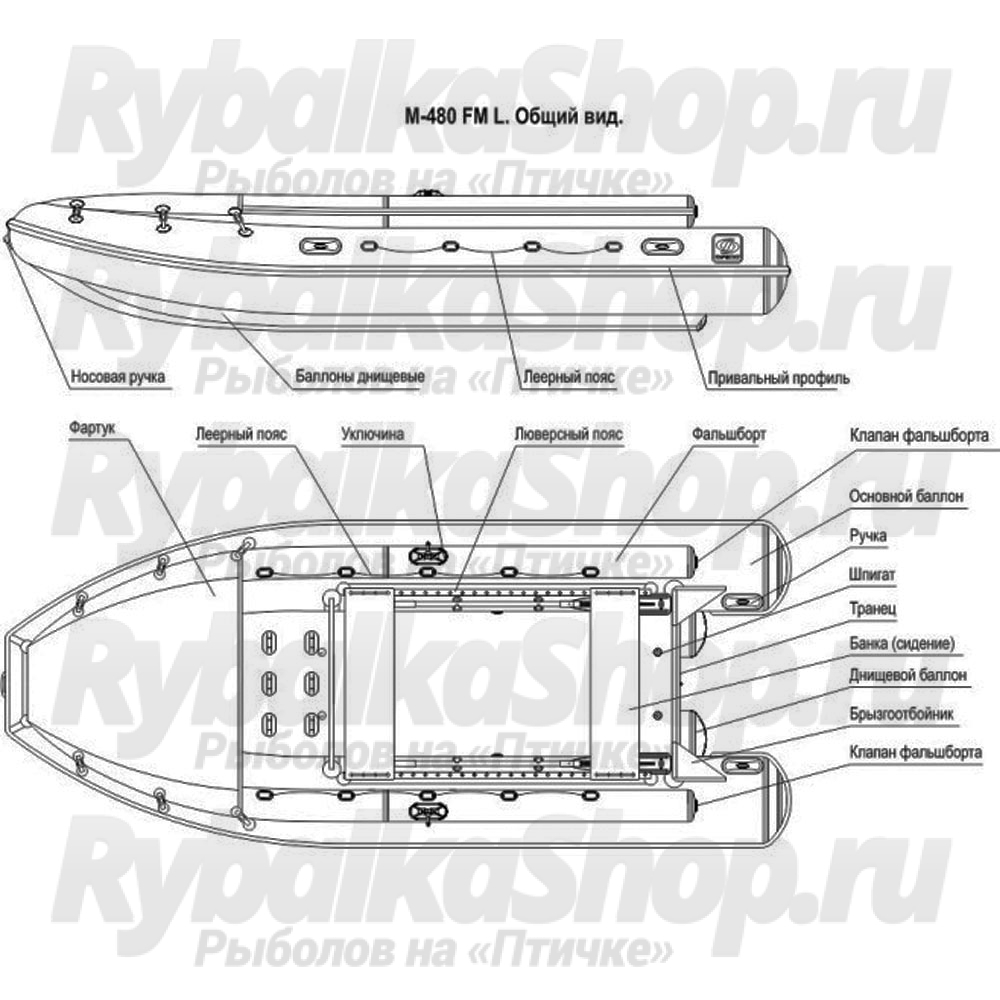 Надувная лодка ПВХ FM L состоит из подковообразного баллона, разделенного на 4 независимых отсека, с приклеенным к нему фальшбортом, состоящим из двух независимых одноотсековых баллонов. Нос сверху закрыт откидывающимся фартуком. В корме корпуса установлен транец, служащий для крепления подвесного мотора. Дно надувной лодки образуют 3 продольных баллона, приклеенных к самоотливной палубе, находящейся при полной загрузке лодки пвх выше уровня воды. Надувная лодка оборудована двумя уключинами, обеспечивающими ее движение под веслами. На корме и носу надувной лодки установлены ручки, служащие для ее переноски в рабочем состоянии. Лодка ПВХ проста в сборке, может эксплуатироваться под мотором до 40 л.с.