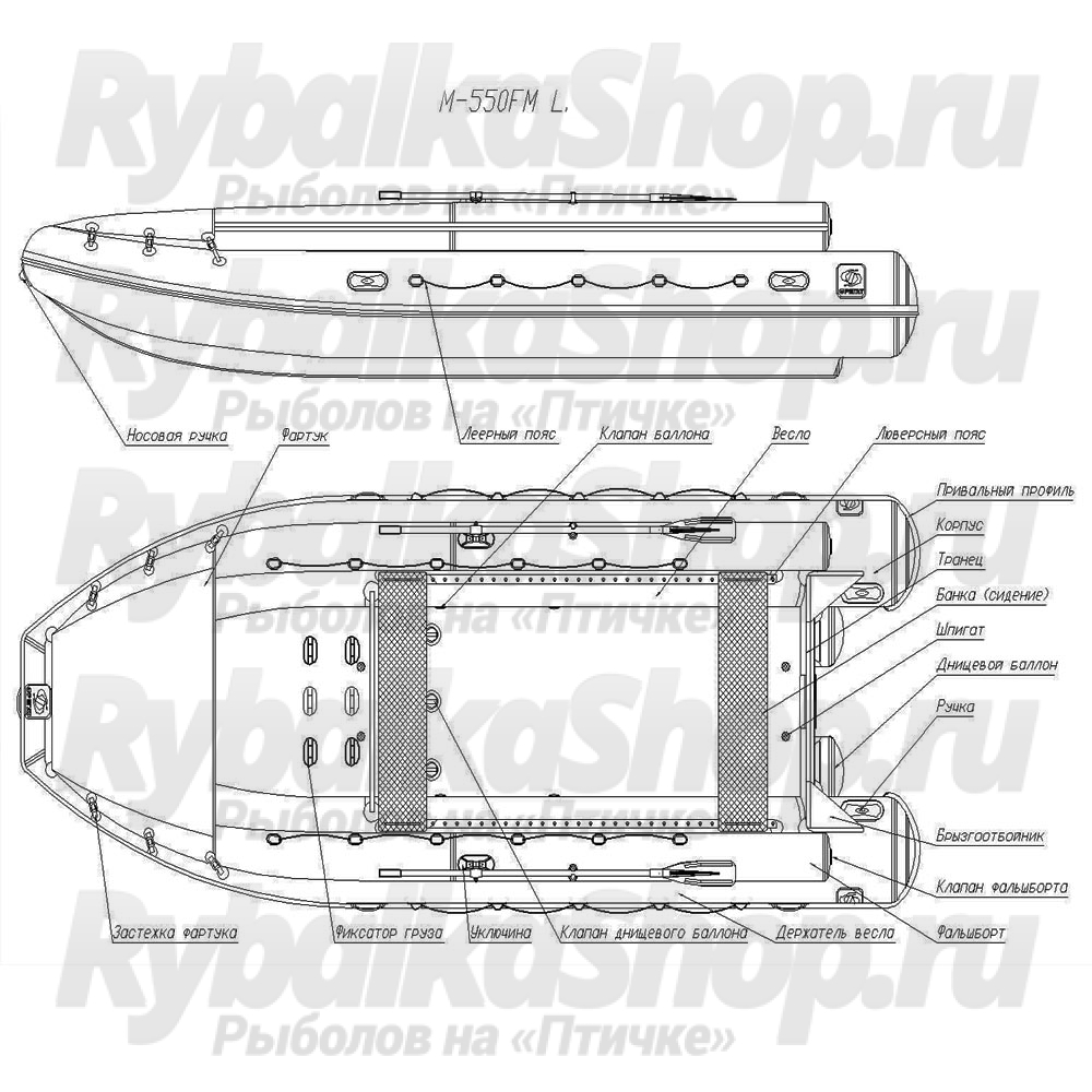 Надувная лодка ПВХ FM L состоит из подковообразного баллона, разделенного на 4 независимых отсека, с приклеенным к нему фальшбортом, состоящим из двух независимых одноотсековых баллонов. Нос сверху закрыт откидывающимся фартуком. В корме корпуса установлен транец, служащий для крепления подвесного мотора. Дно надувной лодки образуют 3 продольных баллона, приклеенных к самоотливной палубе, находящейся при полной загрузке лодки пвх выше уровня воды. Надувная лодка оборудована двумя уключинами, обеспечивающими ее движение под веслами. На корме и носу надувной лодки установлены ручки, служащие для ее переноски в рабочем состоянии. Лодка ПВХ проста в сборке, может эксплуатироваться под мотором до 40 л.с.