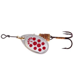 На лепестки MEPPS AGLIA PTS нанесены красные и черные точки. Опытные рыболовы, признавая полезность этой окраски, разделяются во мнениях о причинах ее эффективности. Одни считают, что точки на лепестке повышают контрастность окраски, тем самым провоцируя атаку рыбы. По их мнению, доказательством этого служит уловистость это блесны в мутной воде. Другие — наоборот придерживаются мнения, что эти же точки, при вращении сливаясь в мягкие линии, делают окраску спокойнее, что меньше настораживает рыбу и придает приманке внешность насекомого. Недаром MEPPS производит некрупные (№1,2,3,4,5) размеры данной модели. Лепестки имеют серебряную, золотую и медную окраски. Вы всегда имеете возможность подобрать наилучшую комбинацию для ваших условий. При вращении угол отклонения лепестка от оси составляет 60°
