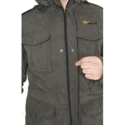 Манжеты рукавов и пояс брюк собраны на широкую простроченную резинку. Капюшон регулируется по овалу лица. На куртке два верхних прорезных с листочками и два нижних накладных кармана с клапанами на кнопках.