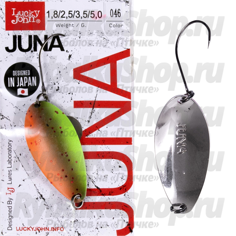 Juna  - новинка 2017 года - cерия колеблющихся блёсен, разработанная японскими специалистами по заказу компании Lucky John для любителей ловли прудовой форели. В отличии от модели Lucky John Cleoблесны Lucky John Juna имеют несколько более огруглую форму и большую площадь по отношению к весу приманки, что позволяет использовать её на самых малых скоростях, тем самым привлекая даже пассивного хищника. Блёсны Lucky John Juna по достоинству будут оценены также любителями ловли головля, окуня и некрупной щуки на спиннинговые снасти ультралёгкого класса. Оснащаются одинарным безбородочным крючком.