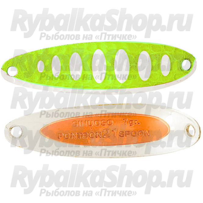 Pontoon21 Sinuoso Spoon - узкотелые колеблющиеся блесна с изогнутым профилем в хвостовой части с двусторонним рисунком и рифленой поверхностью. Внешняя сторона приманки, выполненная в виде рельефной поверхности с нанесенным на нее рисунком, способствует дополнительному привлечению хищника.