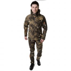 Ткань SOFT SHELL сочетает в себе теплоизолирующие и «дышащие» свойства дополнительного внутреннего материала и ветра - влагоустойчивость, эластичность и прочность наружного слоя. Внешняя поверхность блокирует ветер, а внутренний слой ткани отводит избыточную влагу. Камуфляжный рисунок и цвет дополнительно придаёт костюму визуальную защитную функцию. Куртка с воротником-стойкой и капюшоном с козырьком, где регулируется его глубина шнуром с фиксатором на два отверстия в цвет ткани, и удобным потайным карманом на молнии для упаковывания капюшона. На куртке длинные диагональные карманы на молнии для рук, три кармана на рукавах и один внутренний карман, что приносит удобство в применении костюма в его эксплуатации.