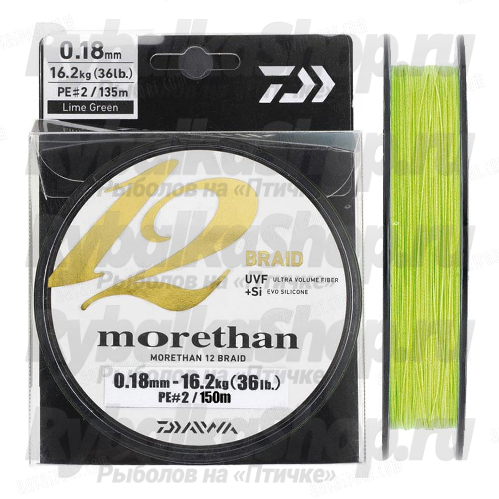 Плетеный  шнур по своим характеристикам и по многим  показателям превзошел своих конкурентов, с обычным 8-ми жильным  плетением шнура. Благодаря уникальной, запатентованной  технологии плетения Hi-density braiding плетеный шнур daiwa morethan 12  braid обладает феноменальной плотностью витков, что в свою очередь  поднимает на новый уровень такие характеристики шнура как:  износостойкость, чувствительность и прочность на разрыв. Технология  UVF и PE + T.P 12Braid с применением обработки EVO + Silicon  обеспечивают невероятную гладкость, превышающую гладкость монофильной  лески, что способствует наиболее дальним забросам даже самых легких  приманок.