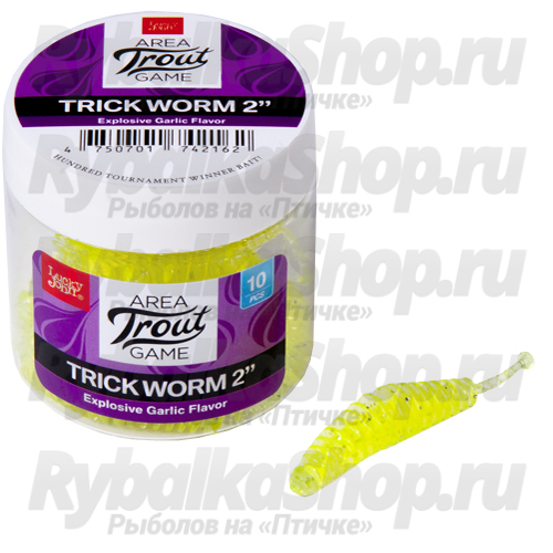 Съедобная резина Lucky John Pro Series Trick Worm 2.0"  выпускается пока что в размере 5 см в шести вариантах расцветок,  которые были протестированы с ошеломительным успехом при ловле прудовой  форели, а также в рыбалке в стиле "рокфишинг" при ловле морской рыбы. В пресных водоемах нашей страны приманка показала отличные  результаты не только при ловле традиционных хищников, но также и  практически всех видов белой рыбы.