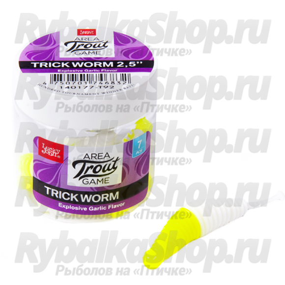 Съедобная резина Lucky John Pro Series Trick Worm 2.0"  выпускается пока что в размере 5 см в шести вариантах расцветок,  которые были протестированы с ошеломительным успехом при ловле прудовой  форели, а также в рыбалке в стиле "рокфишинг" при ловле морской рыбы. В пресных водоемах нашей страны приманка показала отличные  результаты не только при ловле традиционных хищников, но также и  практически всех видов белой рыбы.