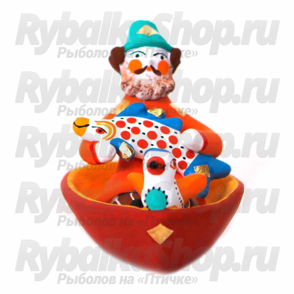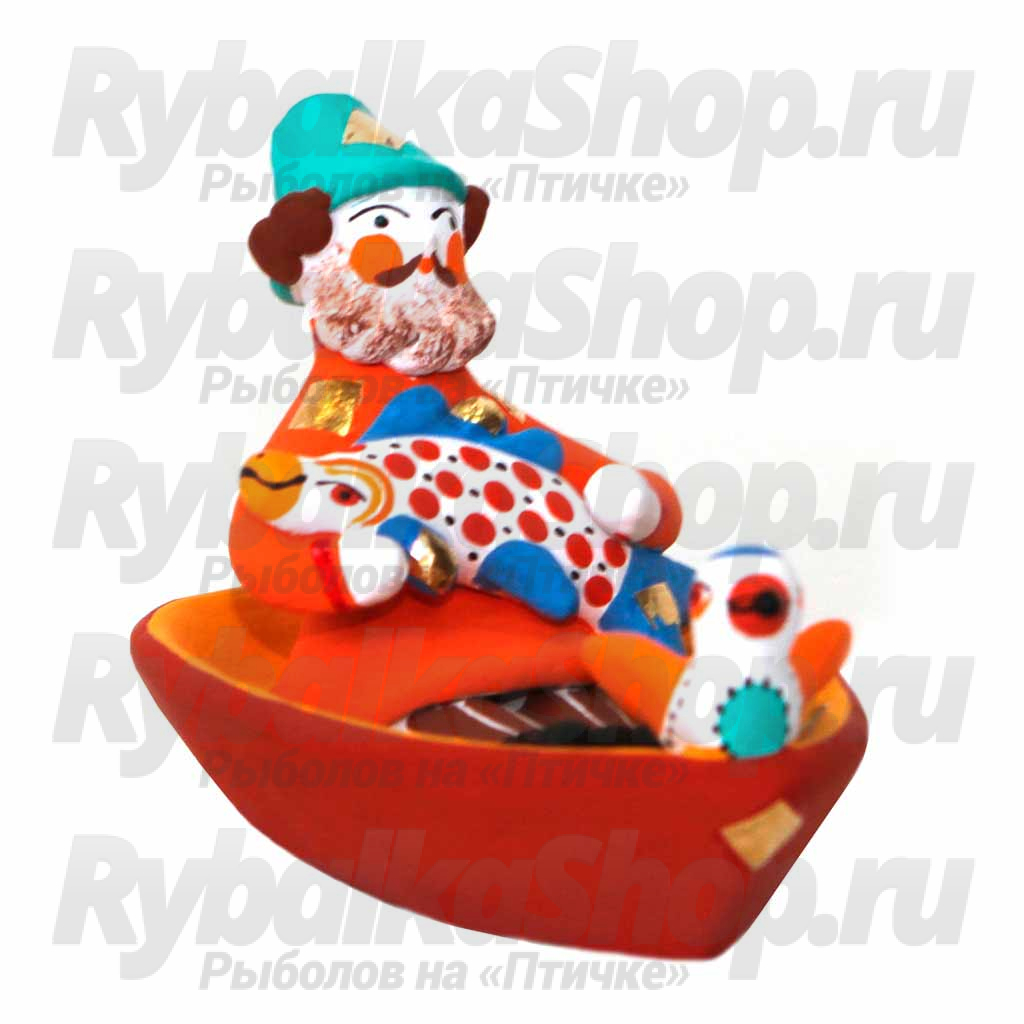 Игрушка "Мужик в лодке с рыбой и птичкой" изготовлена и расписана вручную по традиционной технологии.