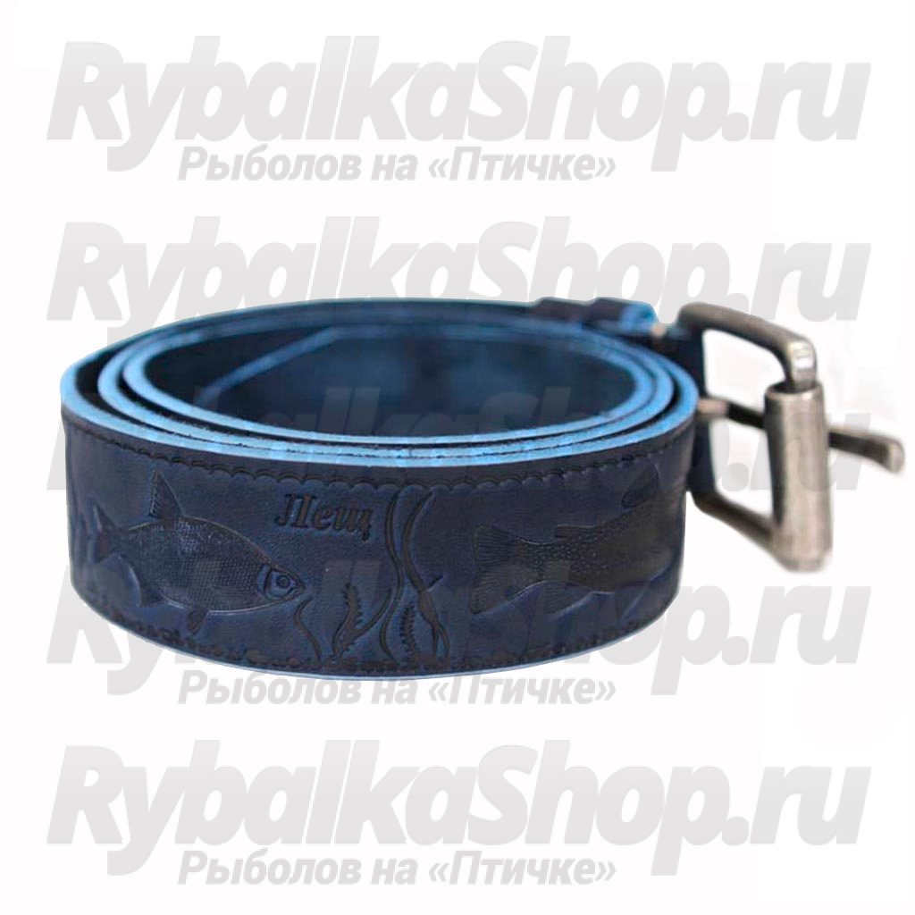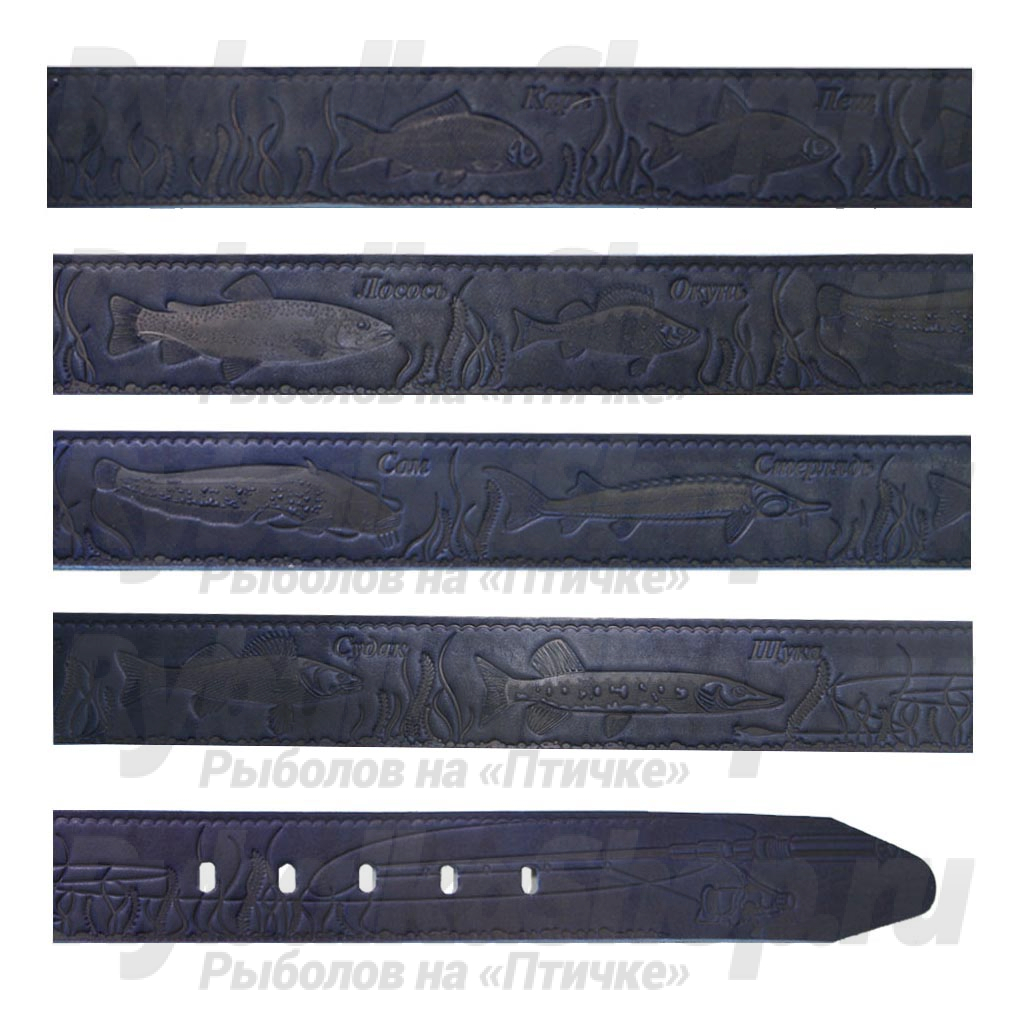 Ремень рыбака из натуральной кожи с тиснением рисунка "Рыбы России". Идеально подходит для ношения как с брюками, так и джинсами. Имеет аккуратную прямоугольную металлическую пряжку классического стиля.
