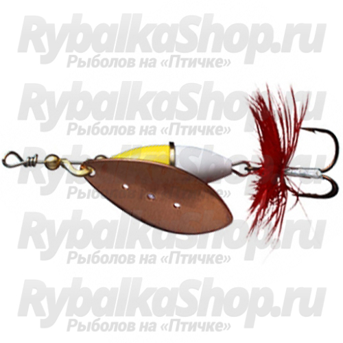 - Компактный сердечник имеет утяжеленный вес. Он расположен на оси приманки, между крючком и лепестком. Этот грузик имеет изящную геометрическую форму вытянутого и чуть сплющенного овала. Овал состоит из двух частей, которые соединяются узким золотистым кольцом, а сами две части окрашены в яркие контрастные цвета. Такая огрузка не только внешне привлекательна, но и оснащает блесну Myran Wipp, великолепными полетными характеристиками.