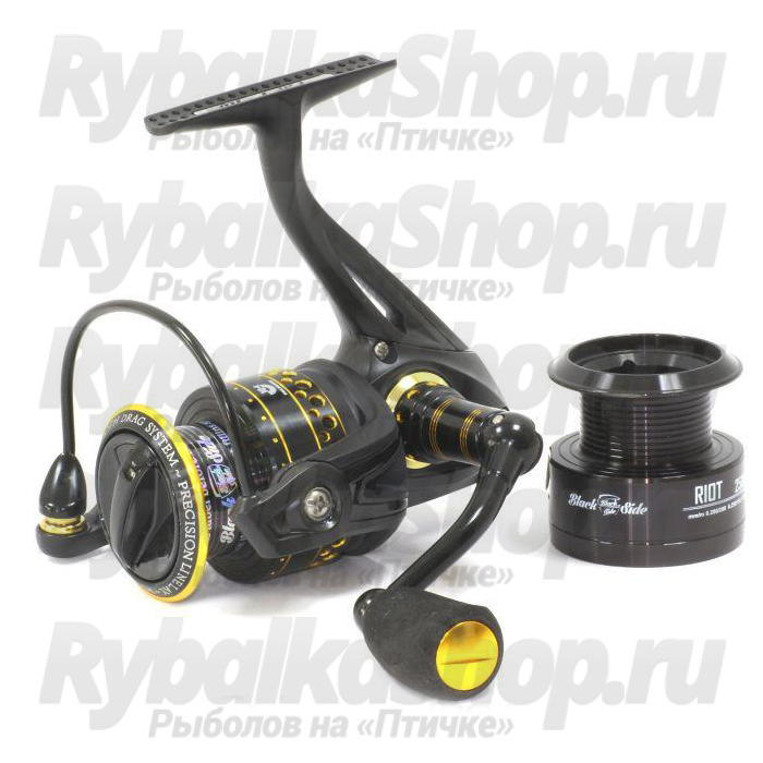 Black Side Riot FD - еще одна линейка качественных безынерционных катушек от рыболовного бренда Black Side, отличающаяся прекрасными характеристиками и приемлемой ценой. Серия включает в себя три модели с индексами 2000, 2500 и 3000, которые имеют одинаковую передатку, равную 5,2:1. У всех катушек фрикционный тормоз имеет переднее расположение. В конструкции Riot предусмотрены 10 шарикоподшипников High Grade японского производства, а также 1 роликовый подшипник, которые обеспечивают удивительно плавную работу всего механизма. Главная силовая передача выполнена из стали и бронзы. Отбалансированный ротор обеспечивает равномерное распределение лески по шпуле. Наличие системы мгновенного стопора обратного хода позволяет избежать случайного проворачивания ротора в обратную сторону. Флажок переключателя реверса располагается в нижней части корпуса. Для избежания запутывания и перехлеста лески в катушках Riot реализованы системы Antitwist Roller и Cone Bail. Дужка лесоукладывателя имеет специальную систему фиксации Cast Lock. Корпус и ротор катушек Black Side Riot выполнены из прочного сверхлегкого сплава, благодаря чему имеют малый вес. Катушки поставляются в комплекте с запасной металлической шпулей. Точеная алюминиевая рукоять имеет возможность переустановки под правую руку и снабжена удобным кнобом из EVA.