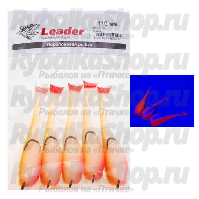 Рыбка поролоновая Leader оснащенная на двойнике 110 мм. Цвет 20 UV упак. 5 шт.