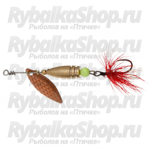 Поверхность лепестка с рисунком чешуи дает неровные блики, неотразимо действующие на рыбу. Латунный сердечник дополнен яркой пластиковой бусиной, которая превосходно заметна даже в пасмурную погоду.