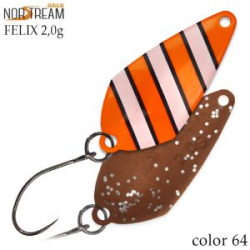 Felix – новинка 2018 года из форелевой программы Norstream Area - дальнобойная модель с достаточно активной работой на всех скоростях проводки. Универсальна и отлично привлекает как активную, так и пассивную рыбу. В линейке три варианта по весу/размеру – 2 г, 2,5 г, 4,3 г.
