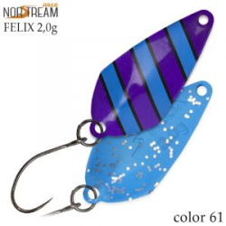 Felix – новинка 2018 года из форелевой программы Norstream Area - дальнобойная модель с достаточно активной работой на всех скоростях проводки. Универсальна и отлично привлекает как активную, так и пассивную рыбу. В линейке три варианта по весу/размеру – 2 г, 2,5 г, 4,3 г.