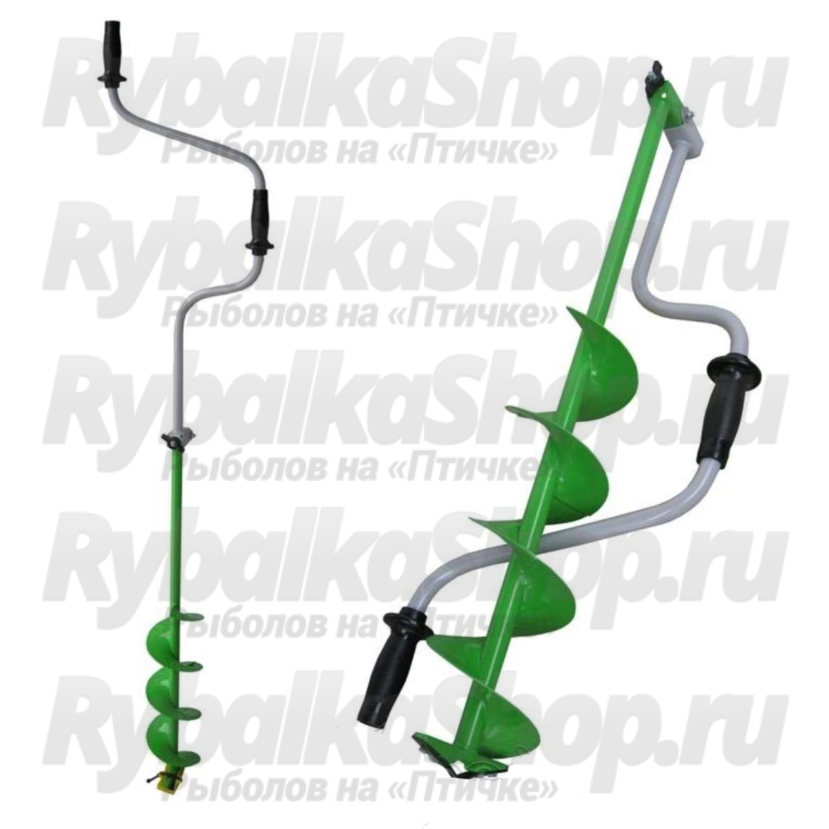 Ледобур "HELIOS" - это складной, двуручный ледобур с левым вращением. Верхняя рукоятка ледобура смещена относительно оси ледобура на 130 мм, а нижняя на 155 мм. Такое расположение рукояток позволяет вращать ледобур одновременно двумя руками, тем самым облегчая процесс бурения лунок во льду.