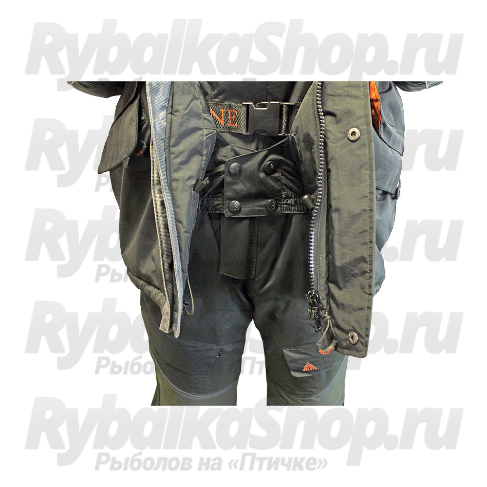 Регулировать размер куртки можно с помощью утяжек. Рукава куртки выполнены с неопреновыми манжетами, которые защищают рыболова от проникновения влаги внутрь рукава. Капюшон с высокой горловиной, застегивающийся на широкую липучку. Капюшон снабжен утяжкой.