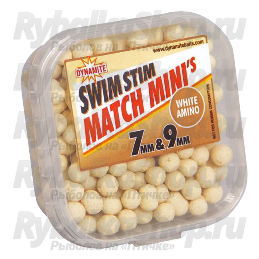 Пеллетс 7 и 9 мм Белый Амино Dynamite Baits (Динамит Бейтс) - Swim Stim Match Minis White Amino, 100 г - основное примененение этих мини бойлов от компании Dynamite Baits (Динамит Бейтс) - ловля рыбы с помощью методных оснасток на коммерческих водоемах с использованием волоса на крючке.