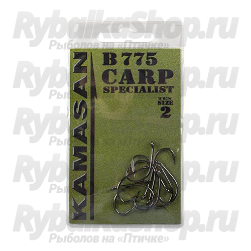 Kamasan B775 Carp Specialist - серии специальных карповых крючков с тефлоновым покрытием, предназначенных для использования их в оснастках, в первую очередь для ловли на бойлы. Крючок с прямым цевьем и широким поддевом, колечко и жало немного согнуты внутрь.