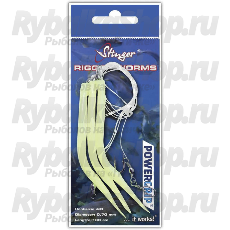 Stinger Rigged Worms - одни из самых популярных приманок для ловли трески. Предлагаются в двух размерах и различных цветах: Fluoro Red – раздражающий оранжевый, Glow – белый со светонакопителем, Miх – универсальный триколор. Оснащены мощными крючками Stinger PowerGrip с защитой от соленной воды.