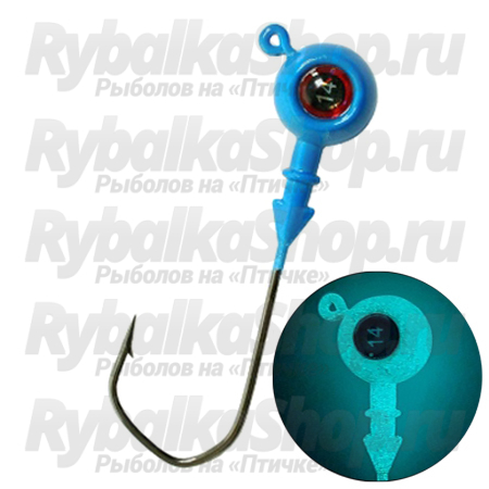Форма головки – шар, это лучший вариант как для работы приманки, так и для результативности всей ловли, который идеально подходит под все типы силиконовых приманок. Для литья джиг-головки использован крючок №3/0, вес свинцовой части - от 4 до 26 грамм. Маркировка веса: голографический глаз с цифрой внутри. Цвет Синий люминофор - флуоресцентный, т.е. светится под воздействием ультрафиолетового излучения. Люминофор - светонакопительное вещество, которое светится в темноте.