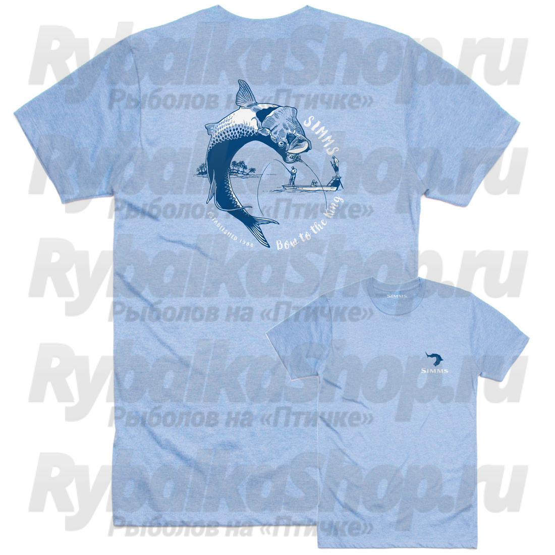 Футболка Simms Bow To The King T-Shirt, Light Blue Heather сшита с использованием новейших технологий ТМ Simms, фирменный запоминающийся арт на груди - вот отличительные черты данного изделия. Футболка прекрасно подойдет как для ежедневной носки, так и для выездов на рыбалку.  Она изготовлена из практичного материала: 52% хлопок, 48% полиэстер.