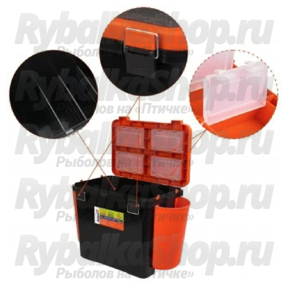 Пластик не подвержен деформациям и прекрасно удерживает первоначальную форму ящика даже при значительном весе рыбака. Ящик из такого пластика не впитывает запахи и легко отмоется от рыбной слизи, глины и других загрязнений. Функциональное основное отделение служит своеобразным каркасом, предотвращающим прогибы ящика и надежно удерживающим вес рыбака. Съемные перегородки предназначены для более удобного хранения принадлежностей.