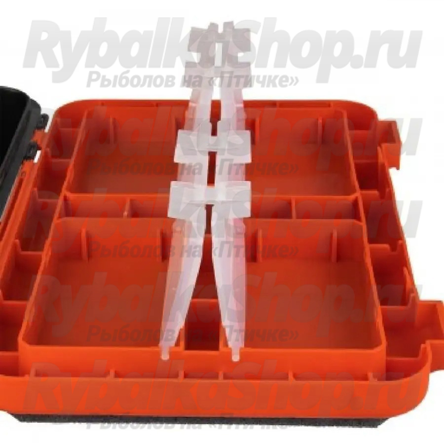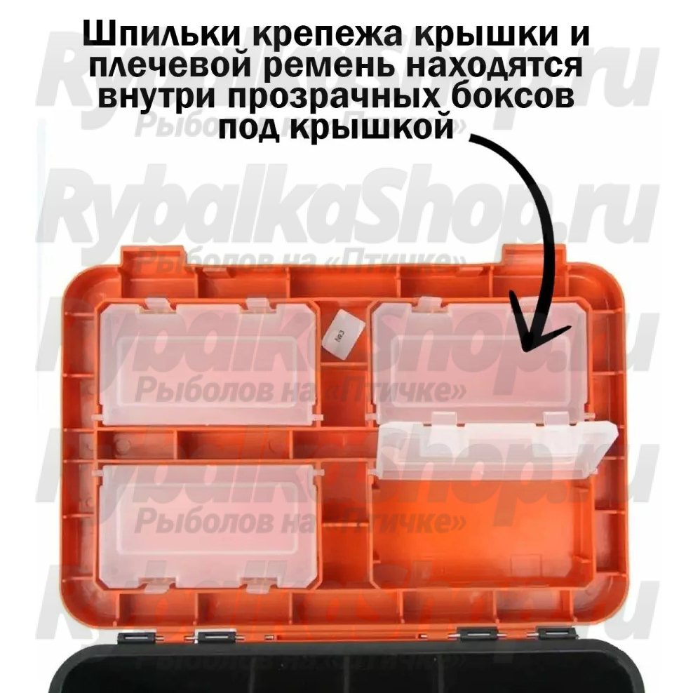На внутренней стороне откидной крышки размещены 4 прозрачных закрывающихся бокса, в которых достаточно места для блесен, балансиров, рыболовных крючков, мормышек и прочих мелких снастей. Вставка-органайзер имеет две секции, где можно удобно разместить удиль