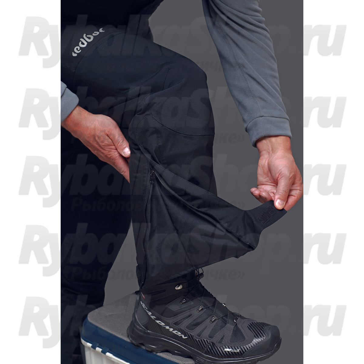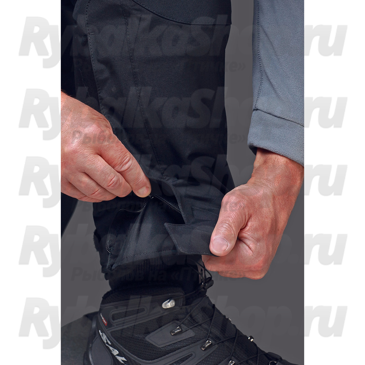 - Вшитый внизу штанин клин под молнией с защитной планкой на липучке (для возможности надеть брюки на голенище сапога)