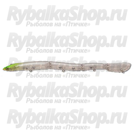 Воблер Megabass Eeler удивляет оригинальной формой и конструкцией. Это многосоставник, собранный из четырех секций с надежным шарнирным соединением. Внешне имитирует небольшого угря, имеет сходство с вьюном. Выполнен из стойкого и прочного пластика, с присущим бренду безупречным качеством исполнения. Поверхность хорошо обработана, швы почти незаметны, наружных дефектов не наблюдается. Относится к категории медленно тонущих, рабочий горизонт не превышает одного метра. Несмотря на особенности конструкции, отличается устойчивыми полетными свойствами и приличной дальностью.