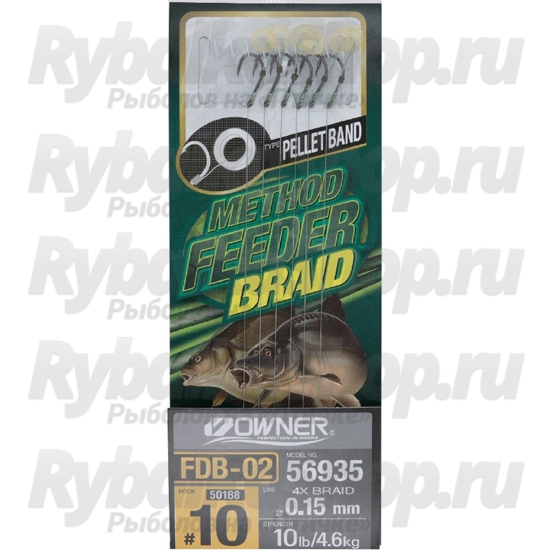 Крючки Owner FDВ-02 для карпфишинга и другой мирной рыбы, с готовым поводком, для облегчения монтажа при фидерной ловле на берегу водоемов и экономии времени. Эти крючки с поводком предназначены для монтажа по типу Feeder Method в Карпфишинге, с готовой фиксацией для удерживания наживки на волосе монтажа возле крючка. Что облегчает и экономит время при наживлении насадки на монтаж. Система монтажа Rig Pellet Band FDВ-02 предназначена для наживления плавающих наживок, на примере бойлов Pop-Up. Фиксация данного типа наживок осуществляется за счет силиконового кольца в которое помещают наживку. Оно фиксирует наживку, и за счет своей эластичности в момент растворимости наживки в воде продолжает удерживать ее до полного растворения в воде. Длина поводков составляет 10 см, а диаметр лески с разрывной нагрузкой подобран под размеры крючков в соответствии с предполагаемыми нагрузками и размерами рыбы и ловли под тип монтажа Feeder Method.