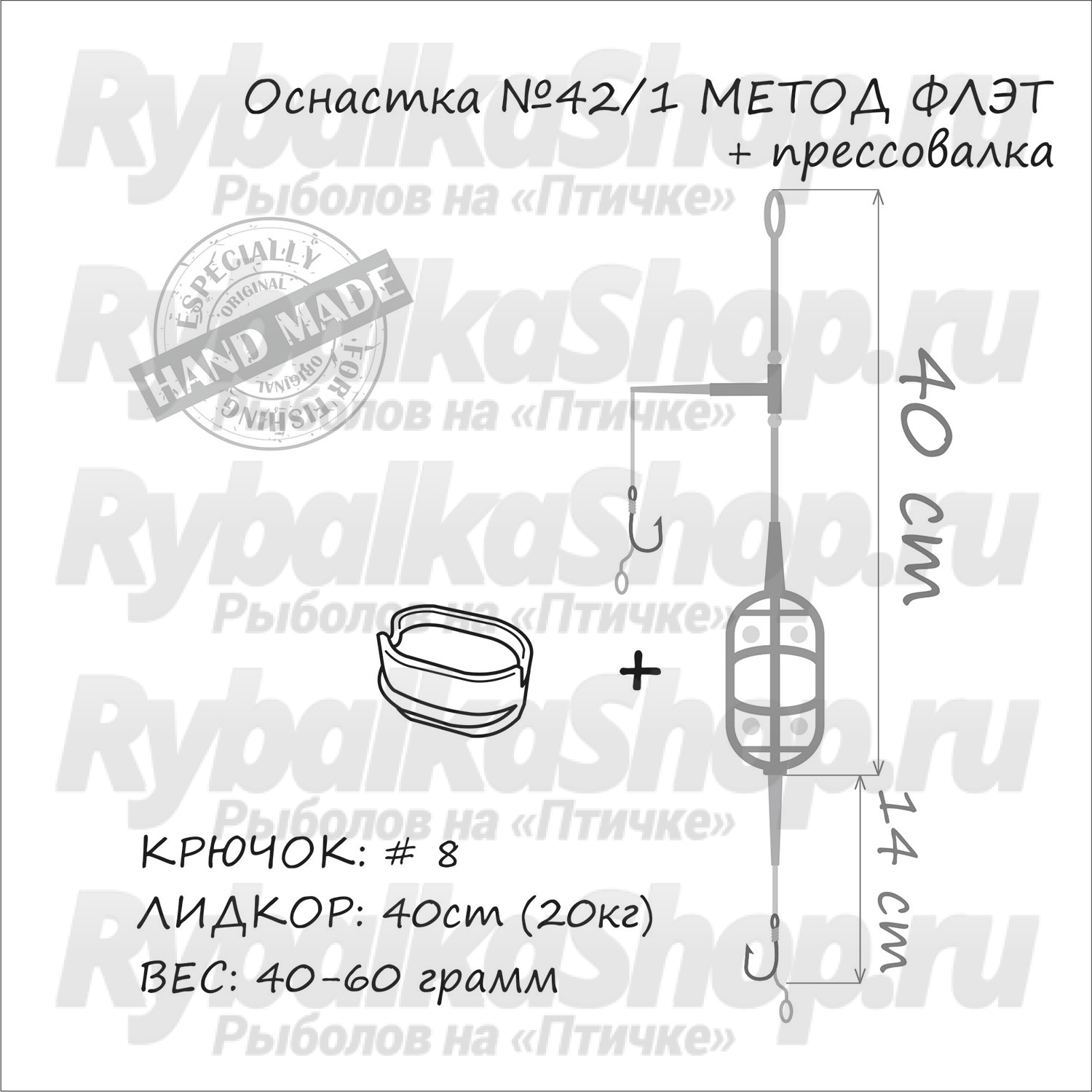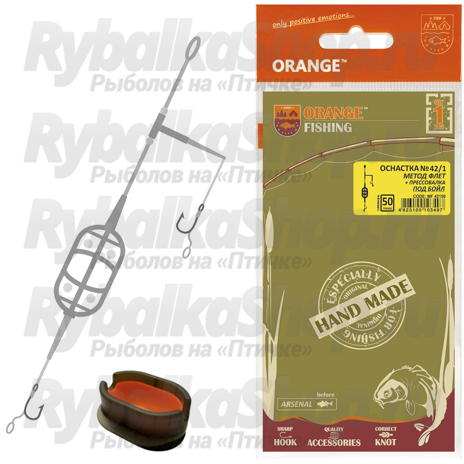 Оснастка Orange #42/1 – оснастка для ловли карпа “Method flat” на 2 крючка, под бойл. Изготовлена из высококачественных комплектующих: кормушка ORANGE Method flat, карповый поводковый материал ORANGE Carpx8, лидкор (проклеенный) фирмы Ockert (Germany), крючки под бойл Kumho (Korea). В комплекте прессовалка для прикормки.