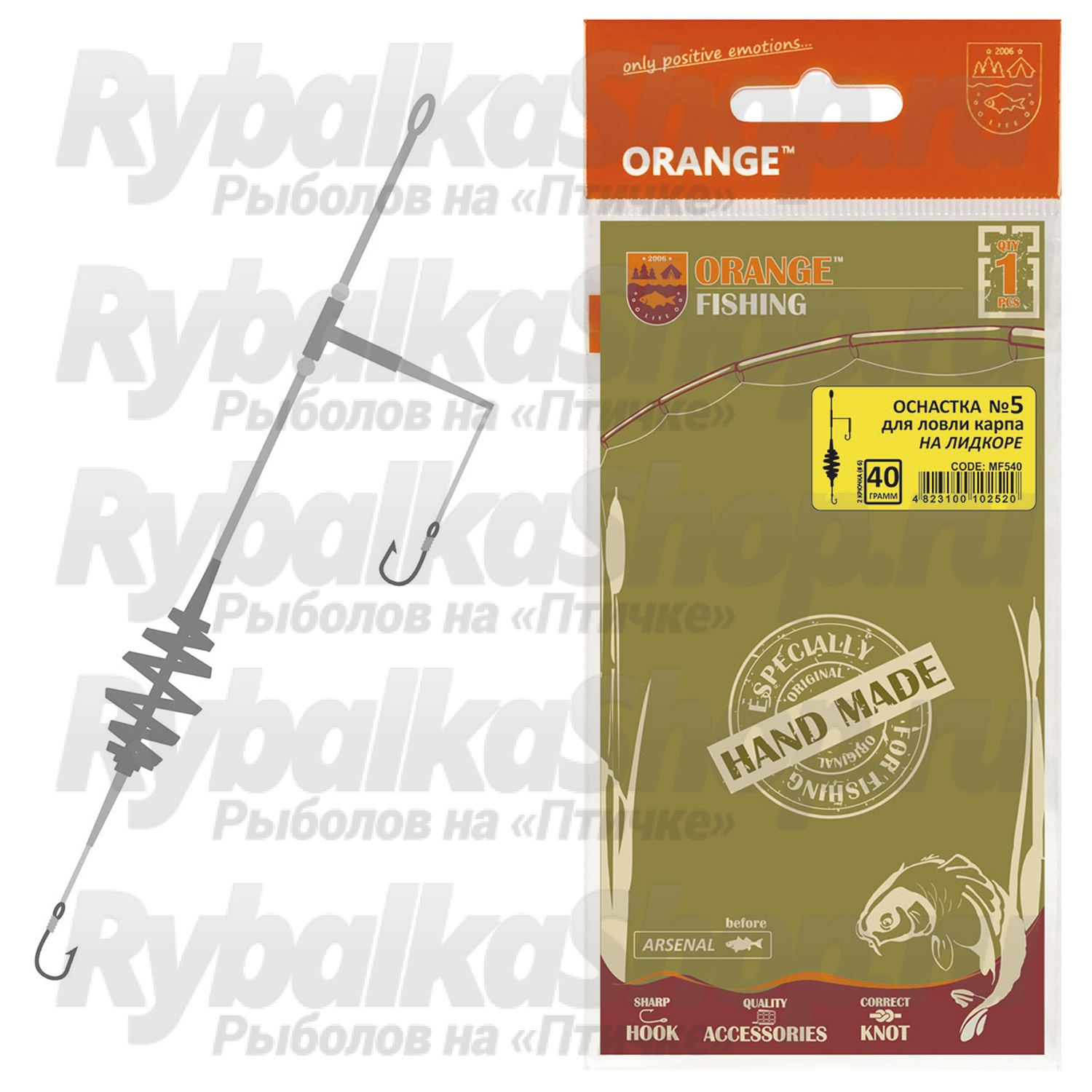 Оснастка Orange №5 - оснастка для ловли карпа “На лидкоре” на 2 крючка. Изготовлена из высококачественных комплектующих: кормушка Пружина, карповый поводковый материал ORANGE Carpx8, лидкор (проклеенный) фирмы Ockert (Germany), крючки Kumho (Korea).