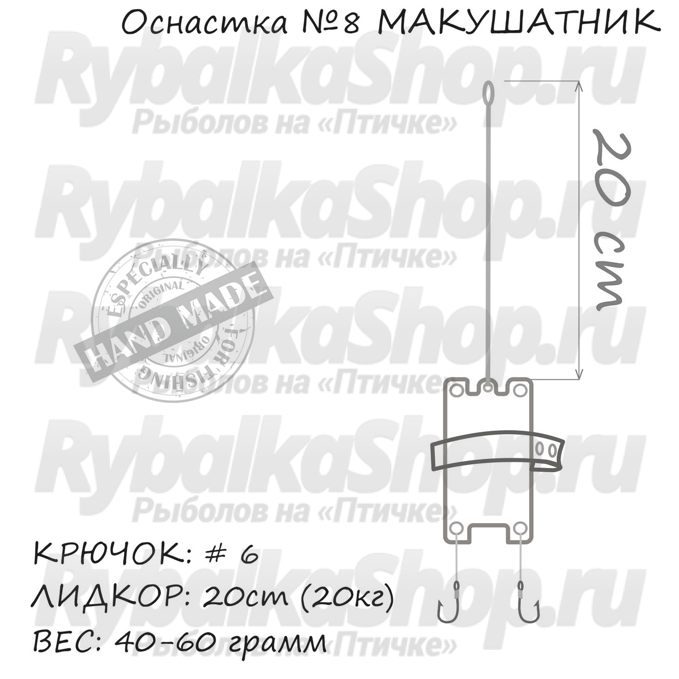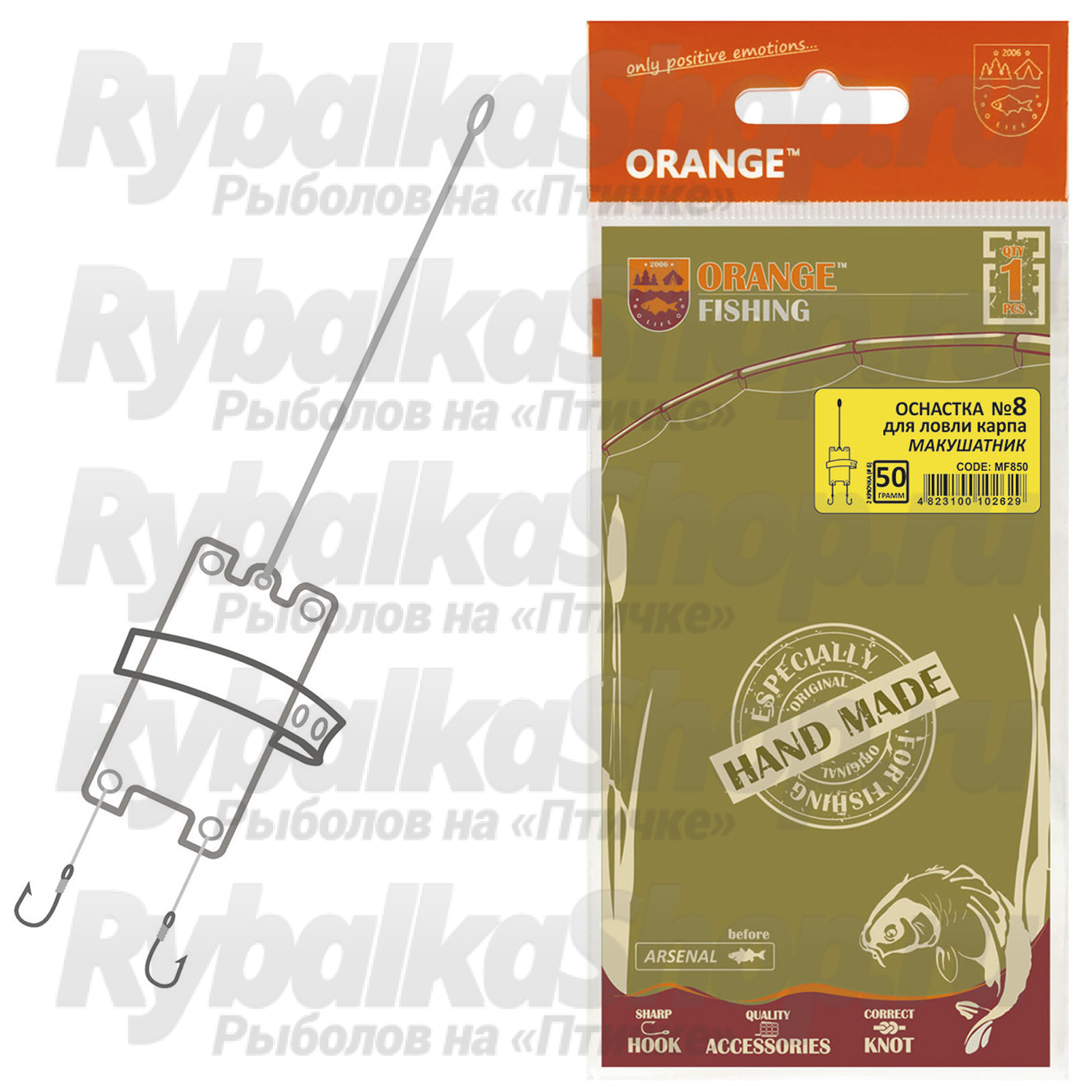 Оснастка Orange №8 - оснастка “Макушатник” на 2 крючка. Изготовлена из высококачественных комплектующих: макушатник с защелкой, карповый поводковый материал ORANGE Carpx8, лидкор (проклеенный) фирмы Ockert (Germany), крючки Kumho (Korea).