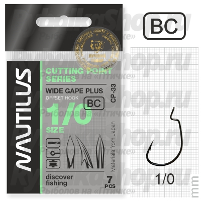 Крючок офсетный Nautilus Offset Cutting Point series Wide Gape Plus CP-33 BC. Мощный крючок, с глубоким поддевом, подходящий для крупных, широкотелых приманок. Жало крючка заточено по технологии Cutting Point, что делает его очень острым, и позволяет оставаться таким очень долгое время.